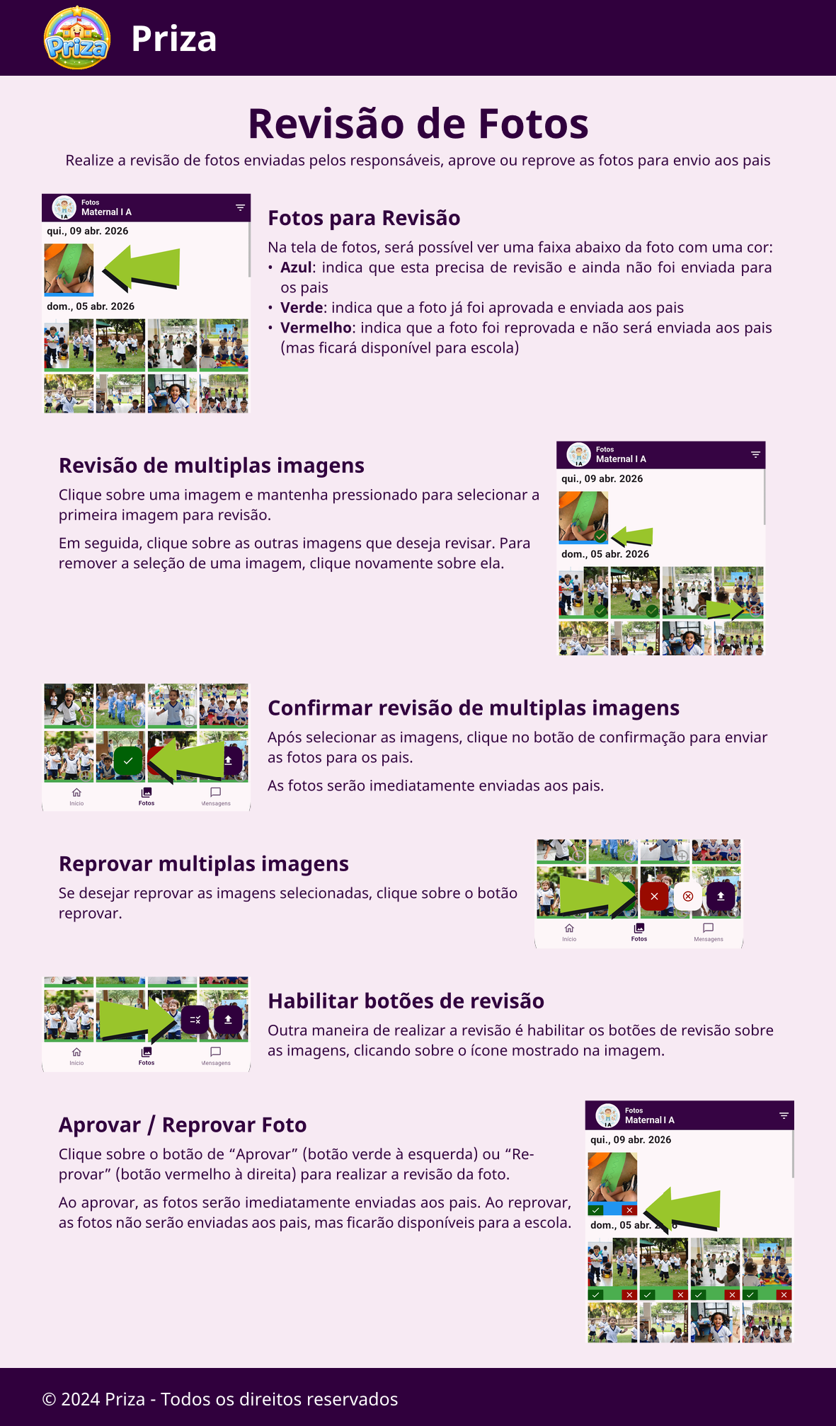 Ao aprovar, as fotos serão imediatamente enviadas aos pais. Ao reprovar, as fotos não serão enviadas aos pais, mas ficarão disponíveis para a escola.